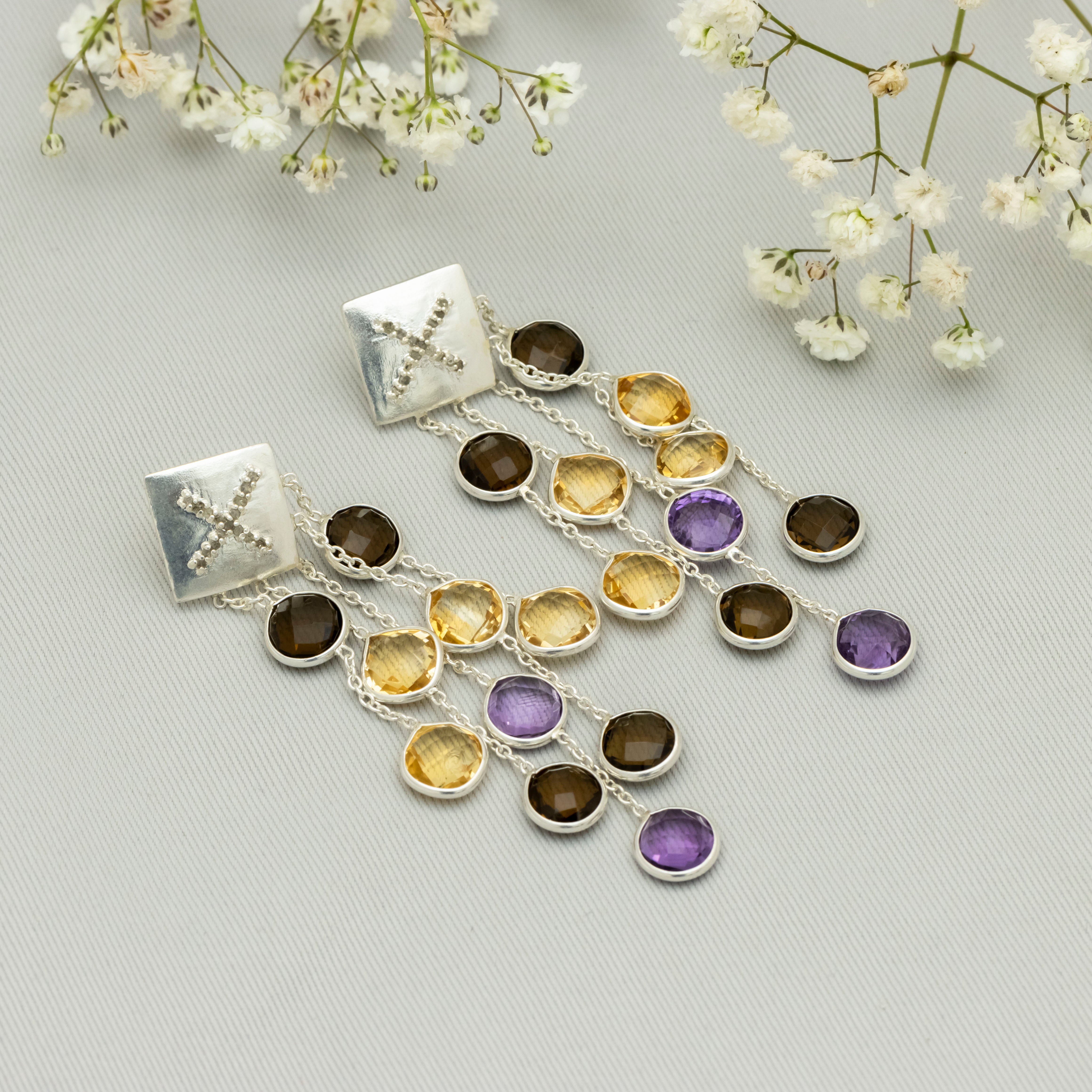 Indulge in the exquisite elegance of these stunning earrings, a true testament to the artistry of fine jewelry. Crafted from lustrous 925 silver, these earrings showcase a harmonious blend of vibrant purple amethyst, sunny yellow citrine, and pristine white hassonite stones, each meticulously set to create a captivating visual symphony. The rich hues of the amethyst evoke a sense of regal sophistication, while the citrine adds a touch of warmth and cheerfulness, perfectly complemented by the ethereal glow of the white hassonite. Designed to catch the light with every movement, these earrings are not merely accessories; they are a statement of luxury and refinement, destined to elevate any ensemble, whether for a grand occasion or an intimate gathering. Embrace the allure of these remarkable earrings and let them become a cherished addition to your jewelry collection, embodying both beauty and timeless elegance.