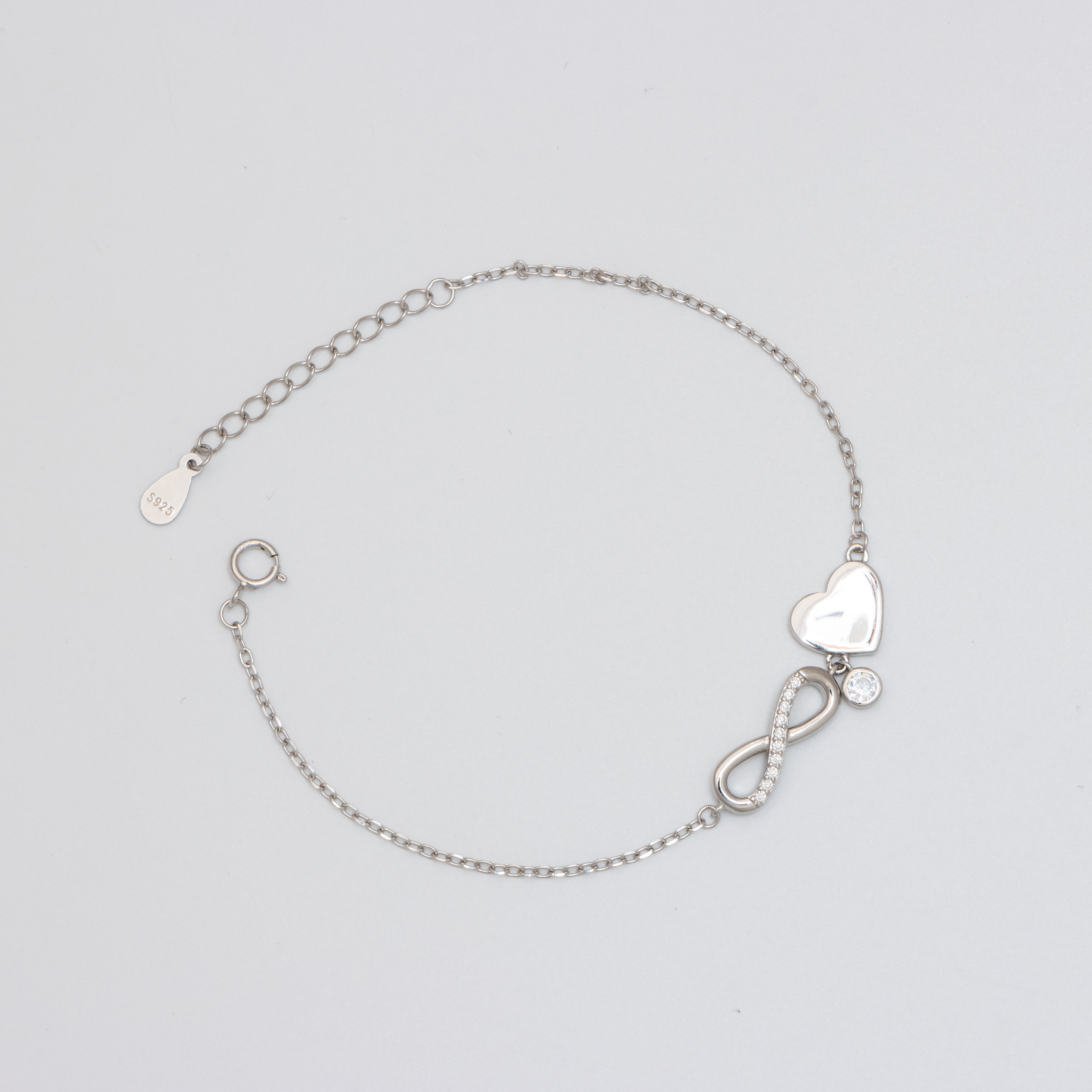 Adorn your wrist with this exquisite 925 silver bracelet, featuring a delicate heart intertwined with an infinity chain, symbolizing eternal love and connection. The centerpiece sparkles with a brilliant diamond, adding a touch of opulence to this timeless piece. Perfect for any occasion, this bracelet effortlessly elevates your style, making it a cherished addition to your jewelry collection.
