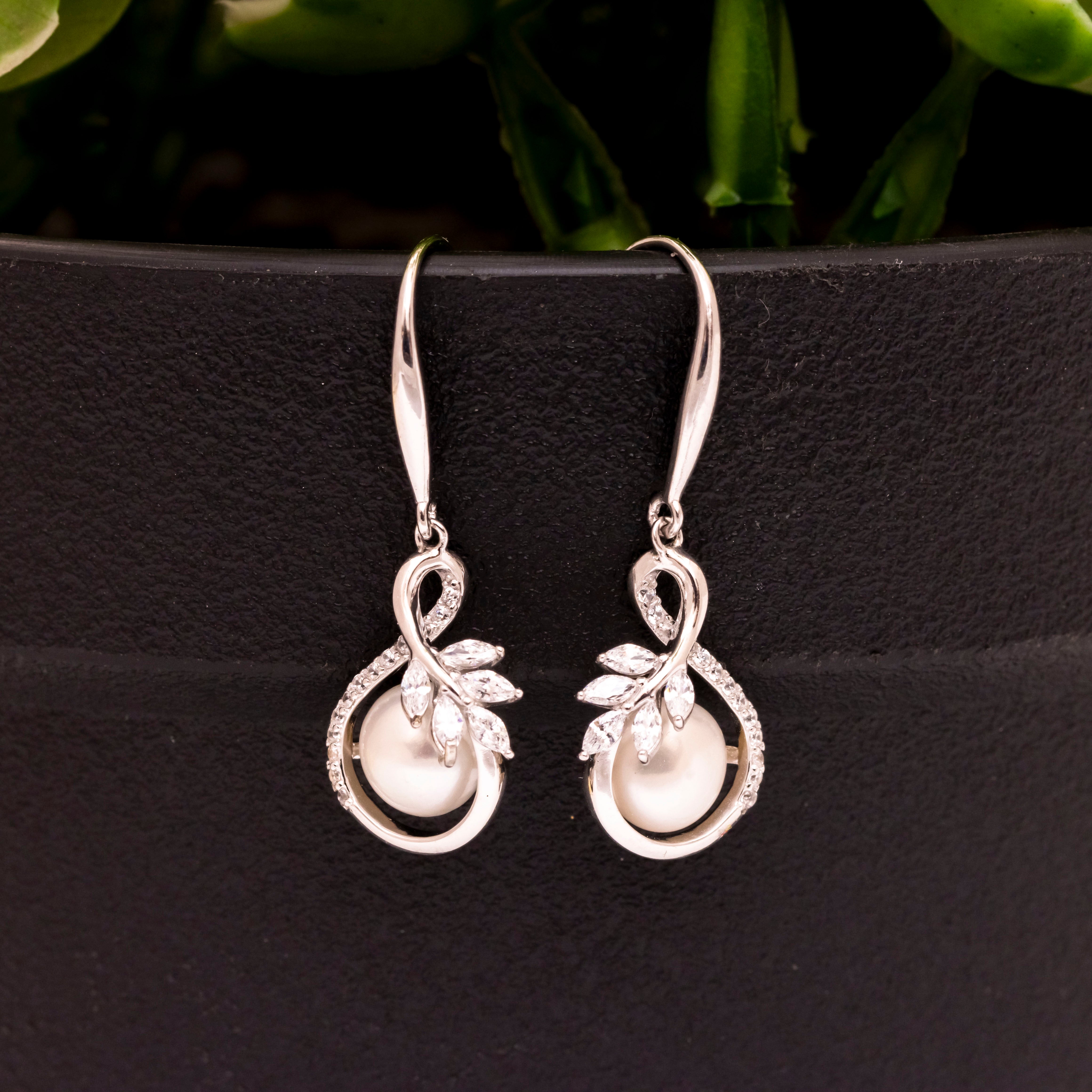 Elevate your elegance with this exquisite pair of white pearl and diamond earrings, meticulously crafted to enhance any ensemble. Each earring features a lustrous white pearl, renowned for its timeless beauty and sophistication, delicately suspended from a shimmering 925 silver setting. The addition of sparkling diamonds accentuates the pearls, creating a captivating contrast that catches the light with every movement. These earrings are not only a stunning accessory but also a symbol of refined taste, making them the perfect choice for special occasions or as a luxurious everyday adornment. With their classic design and high-quality materials, these earrings promise to be a cherished addition to your jewelry collection for years to come.