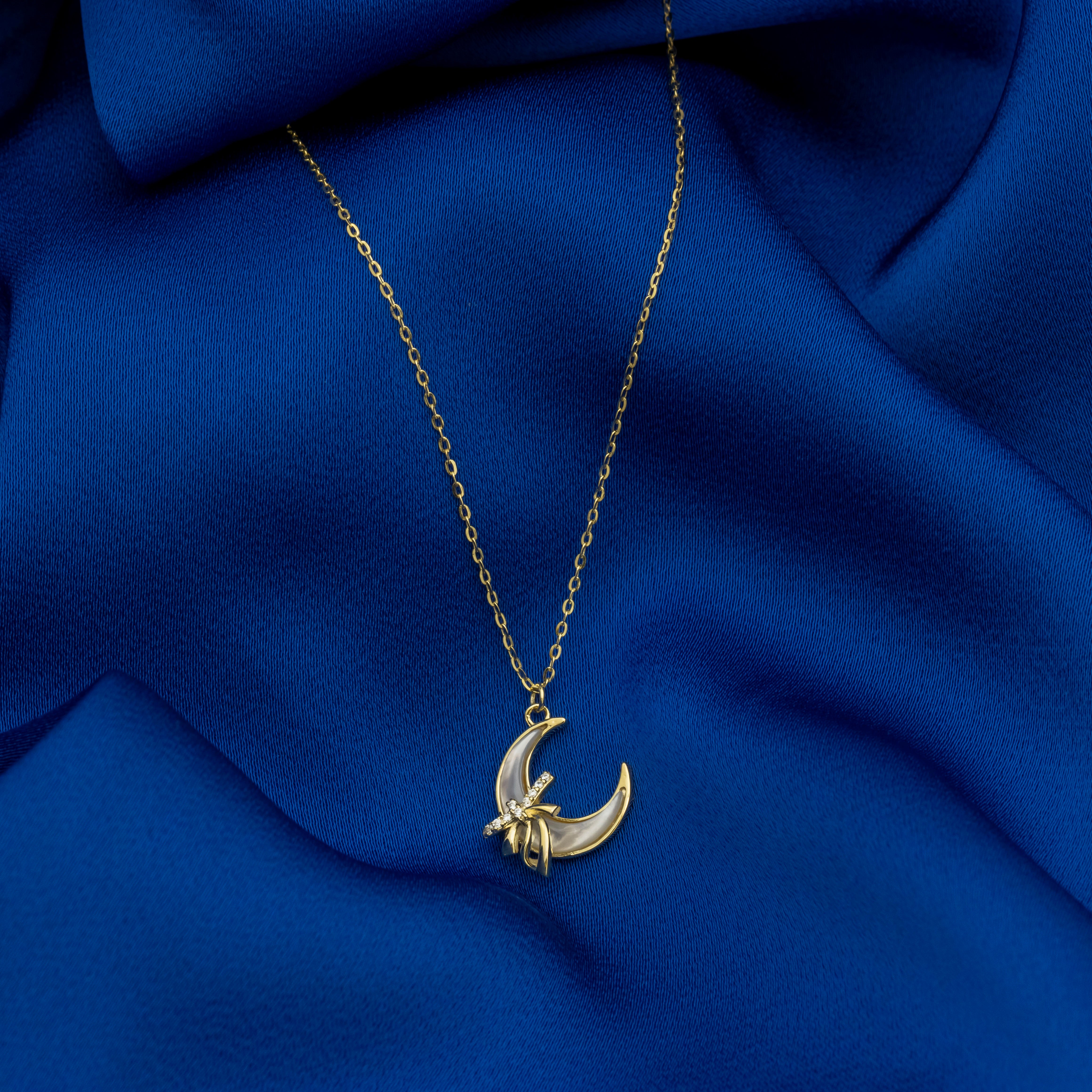 This exquisite gold crescent necklace is a stunning piece of jewelry that beautifully combines elegance and whimsy. Crafted from high-quality 925 silver, the necklace features a lustrous gold finish that enhances its celestial theme. The centerpiece of the design is a delicate crescent moon, adorned with a pristine white moon that radiates a soft glow, symbolizing tranquility and serenity. Accompanying the moon is a charming white butterfly, intricately detailed to evoke a sense of freedom and grace. This enchanting necklace is not only a statement accessory but also a meaningful representation of the beauty of nature and the night sky, making it a perfect gift for those who appreciate unique and artistic jewelry. Ideal for both casual and formal occasions, this piece is sure to elevate any outfit and become a cherished addition to any jewelry collection.