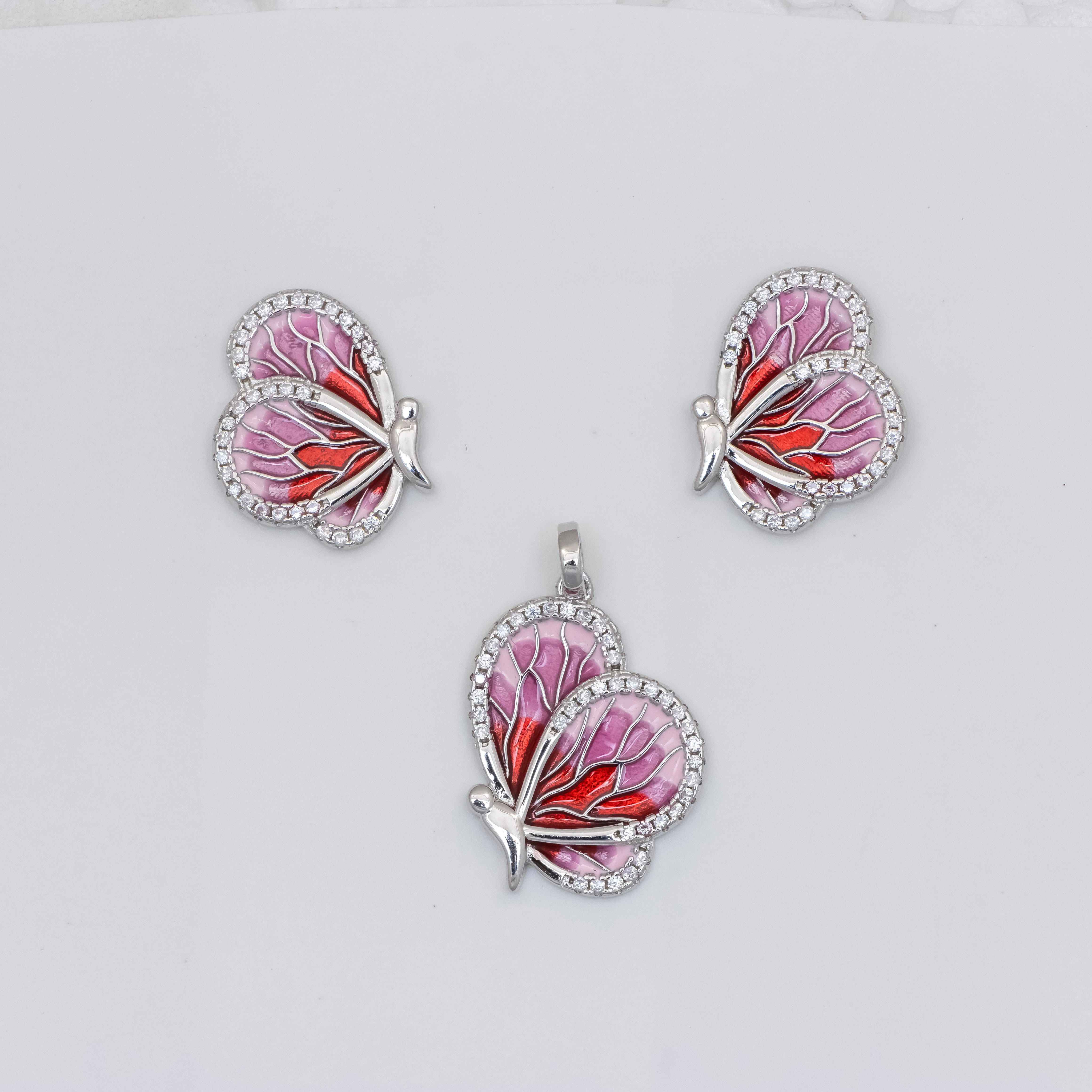 This exquisite butterfly pendant and earrings set is crafted from high-quality 925 silver, showcasing a stunning arrangement of pink and white diamonds. The delicate design captures the elegance of a butterfly, making it a perfect accessory for any occasion. Please note that the set includes only the pendant and earrings; a chain is not included.