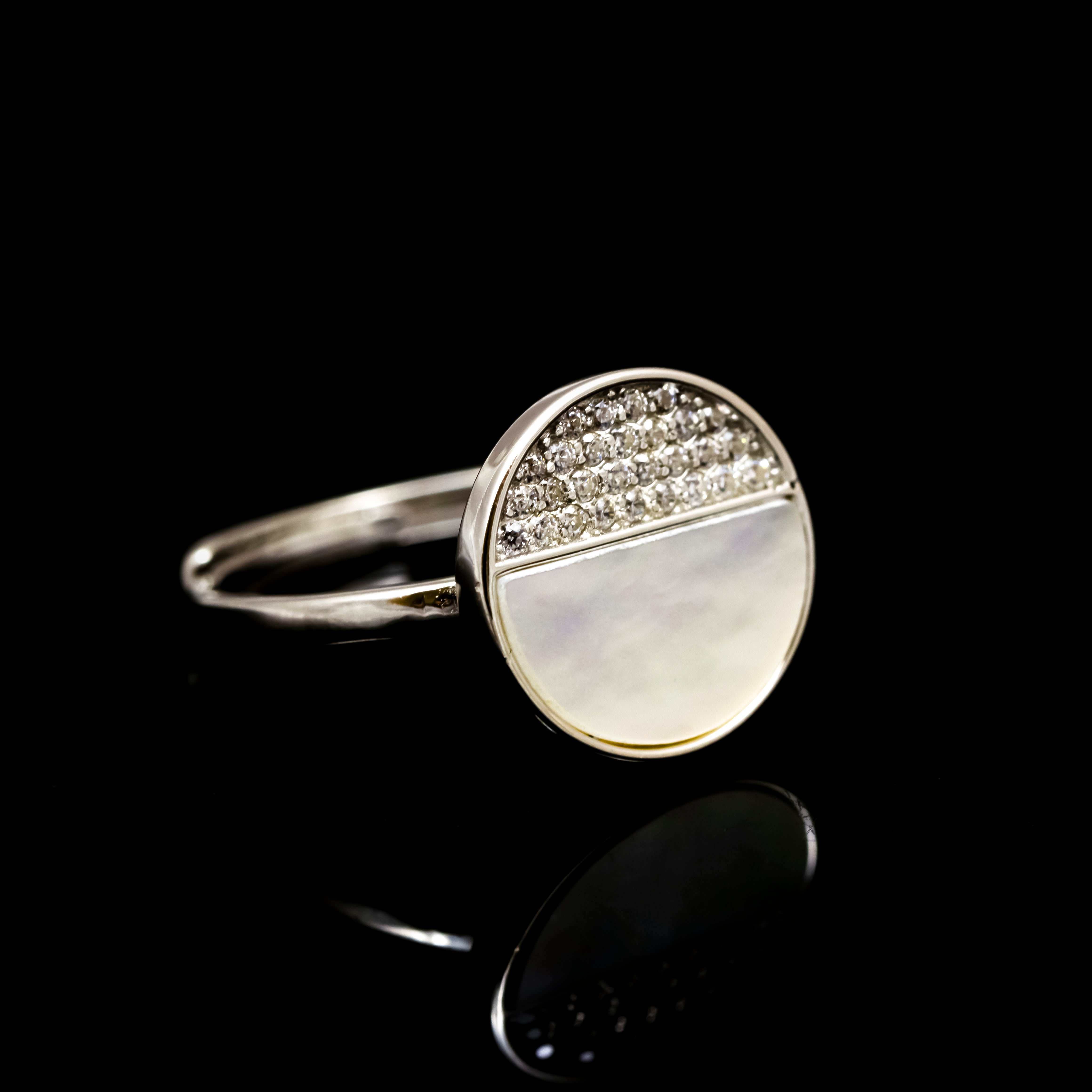 this exquisite ring showcases a stunning combination of white mother of pearl and sparkling diamonds, elegantly set in a 925 silver band that features a luxurious rose gold finish. The iridescent surface of the mother of pearl reflects light beautifully, creating a captivating play of colors that enhances the overall allure of the piece. Surrounding the mother of pearl is a delicate halo of shimmering diamonds, adding a touch of brilliance and sophistication. The silver finish not only complements the cool tones of the silver but also adds warmth, making this ring a versatile accessory suitable for both casual and formal occasions. Crafted with meticulous attention to detail, this ring is a perfect expression of elegance and style, making it an ideal gift for a loved one or a cherished addition to your own jewelry collection.