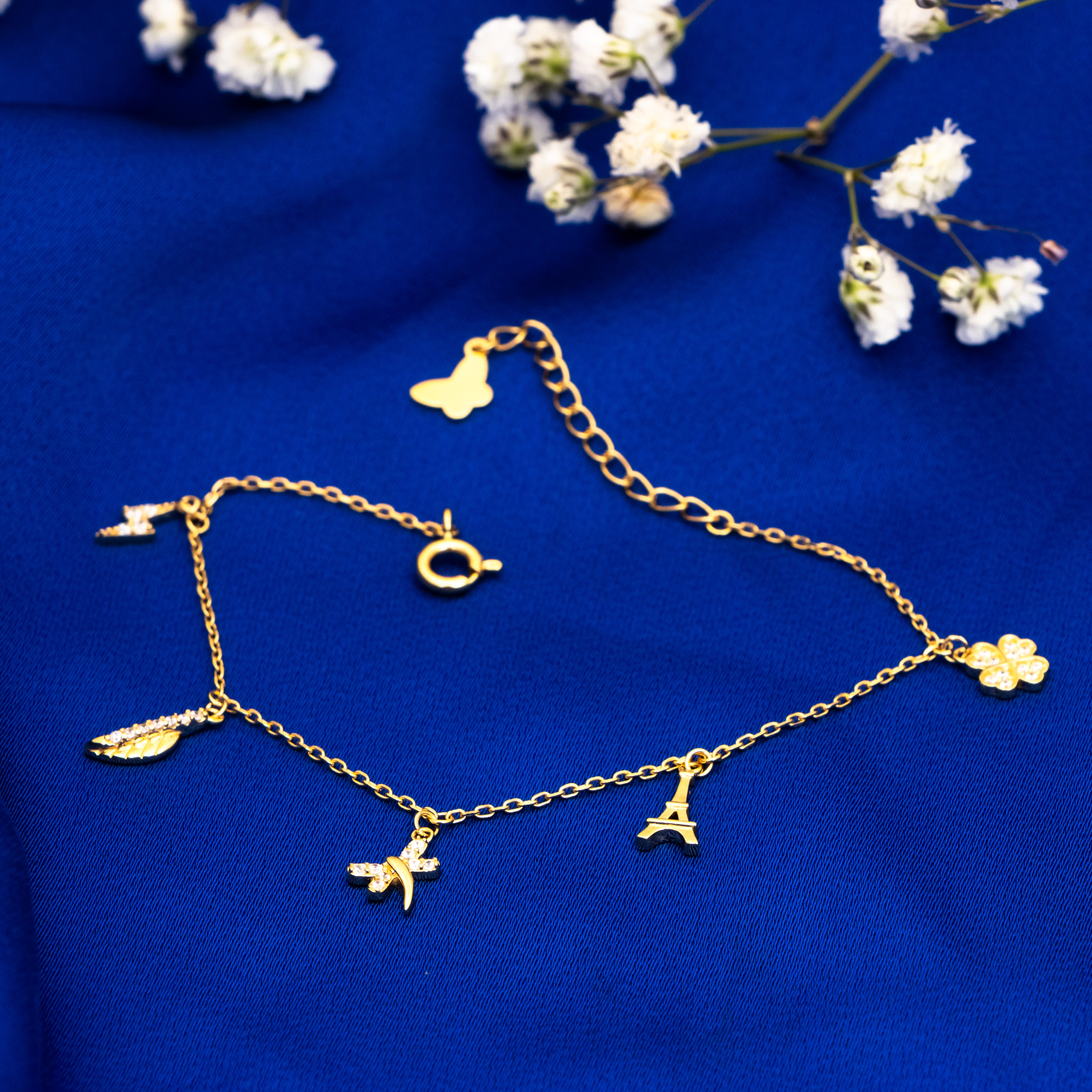 Indulge in the exquisite allure of our gold-plated bracelet, a stunning piece that effortlessly marries elegance with whimsy. Crafted from high-quality 925 silver,this bracelet features an enchanting array of charms that tell a story of adventure and beauty. The delicate clover charm symbolizes luck, while the iconic Eiffel Tower evokes the romance of Paris. A graceful butterfly flutters alongside a vibrant leaf, representing transformation and nature's bounty, while a striking lightning bolt adds a touch of boldness to this captivating ensemble. Each charm is meticulously designed to create a harmonious balance, making this bracelet not just an accessory, but a statement of individuality and style. Perfect for both casual outings and sophisticated soirées, this piece is a must-have for those who appreciate the finer things in life.